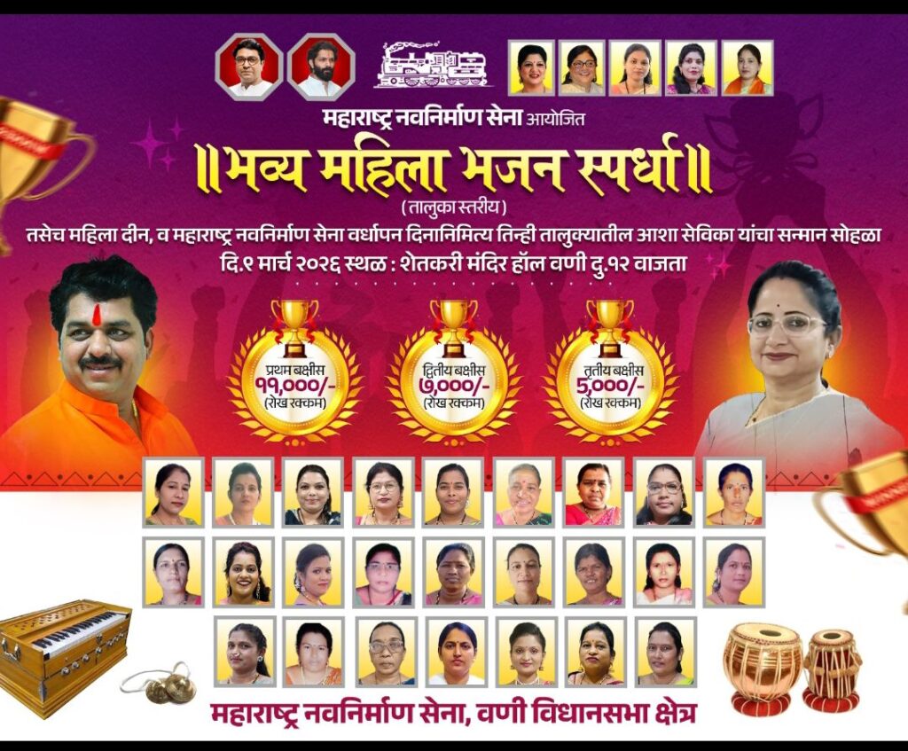 महाराष्ट्र नवनिर्माण सेनेच्या वर्धापन दिनाचे तसेच जागतिक महिला दिनाचे औचित्य साधत वणी येथे महिलांच्या सन्मानासाठी विशेष कार्यक्रमाचे आयोजन करण्यात आले आहे. मनसे नेते राजू उंबरकर यांच्या पुढाकारातून आशा सेविकांचा सन्मान सोहळा तसेच भव्य महिला भजन स्पर्धा आयोजित करण्यात आली असून, या उपक्रमाद्वारे समाजासाठी कार्य करणाऱ्या महिलांच्या योगदानाला मानाचा मुजरा देण्यात येणार आहे.